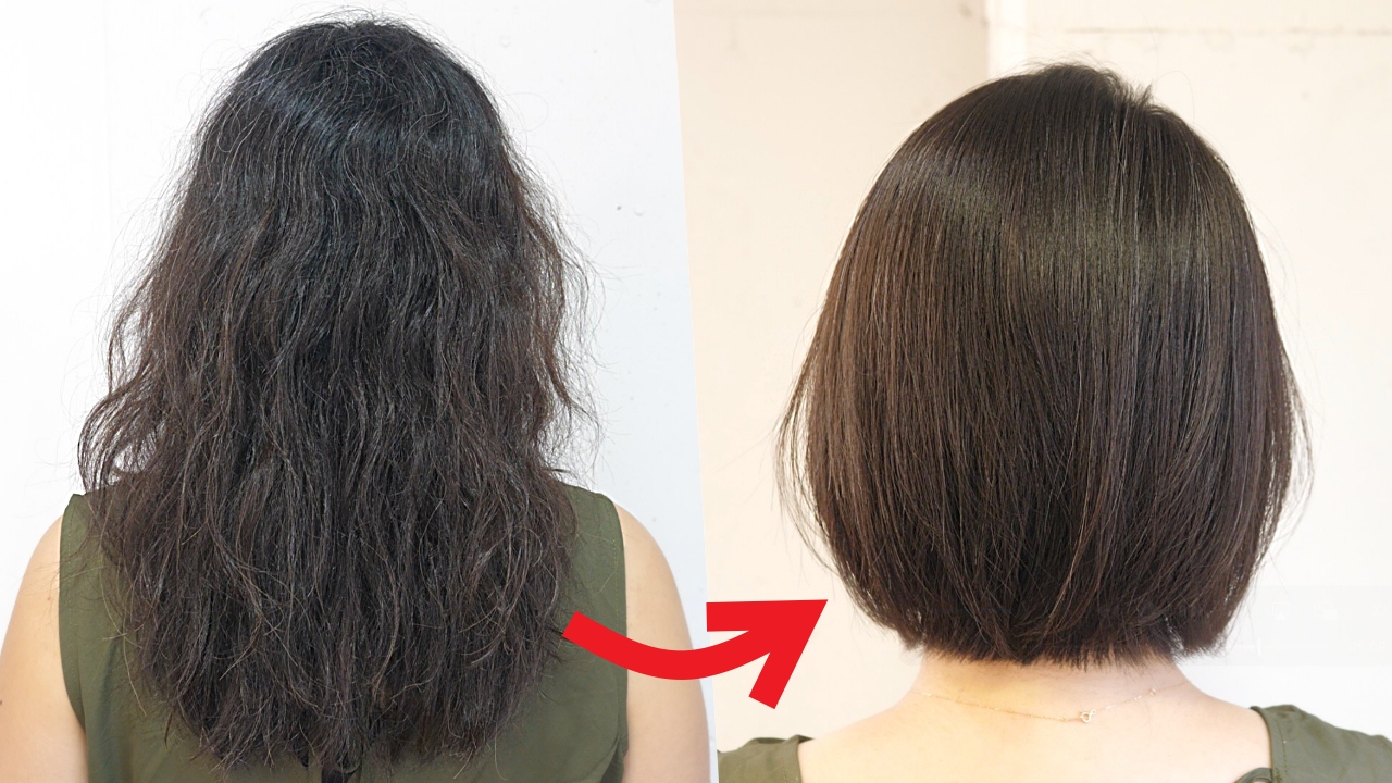 Beforeではロングヘア特有のダメージやパサつき、うねりが気になっていた状態。それがAfterでは、毛先までつるんとまとまった艶ボブに変身!